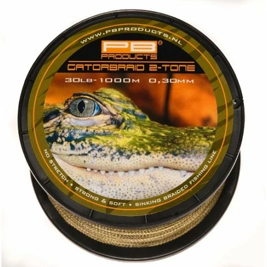 Para evitar el desgarro de las mandíbulas de la carpa, le recomendamos que utilice siempre un tampón de mono o fluorocarbono como tampón. La vista frontal mono proporciona el estiramiento que tanto se necesita mientras se juega. El doble de la longitud de la barra suele ser suficiente como amortiguador. Si desea utilizar Gatorbraid Two-Tone para pescar en una pendiente pronunciada, haga que la mira delantera sea preferiblemente 5 metros más larga que la profundidad a la que está pescando. Para que la línea desaparezca lo mejor posible contra cada superficie durante la pesca, hemos elegido un color de camuflaje ideal. Gator Braid ha estado en el programa de PB Products durante años y por una buena razón.
